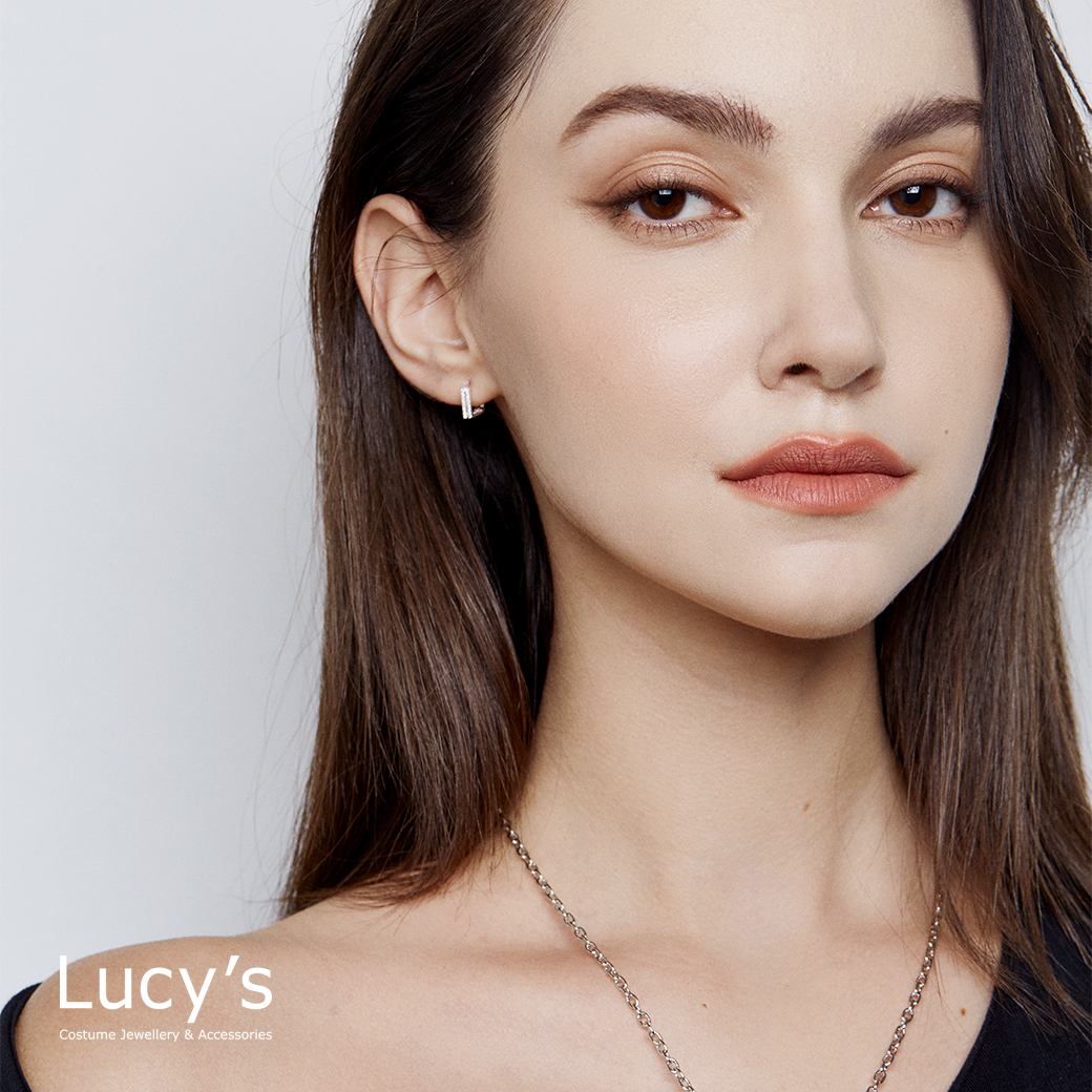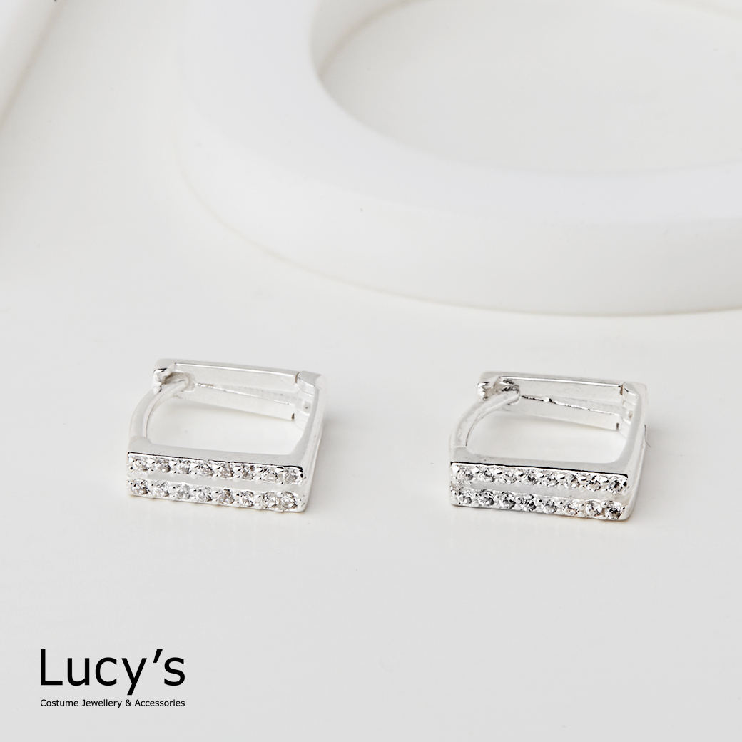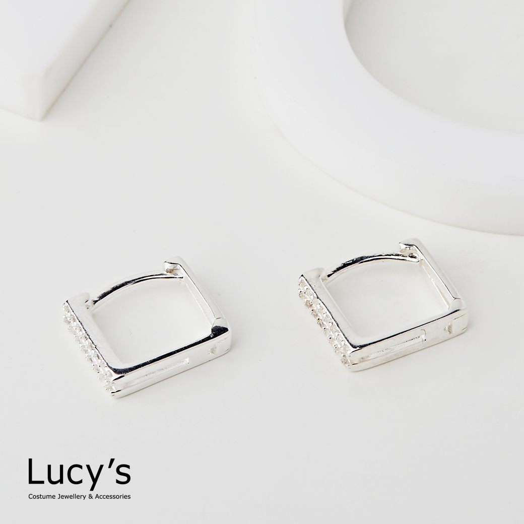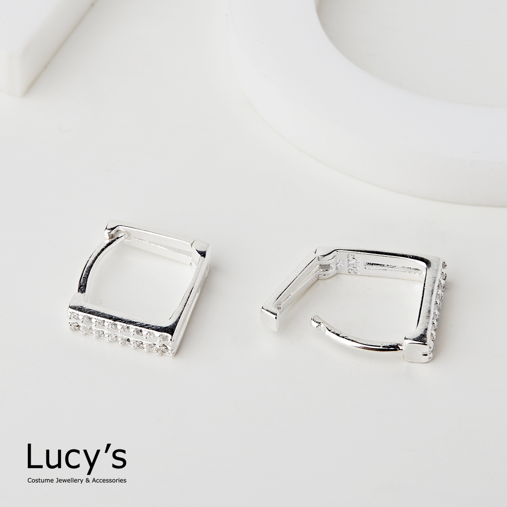 925純銀 方形鏤空鑲鑽 易扣耳環 (113372)